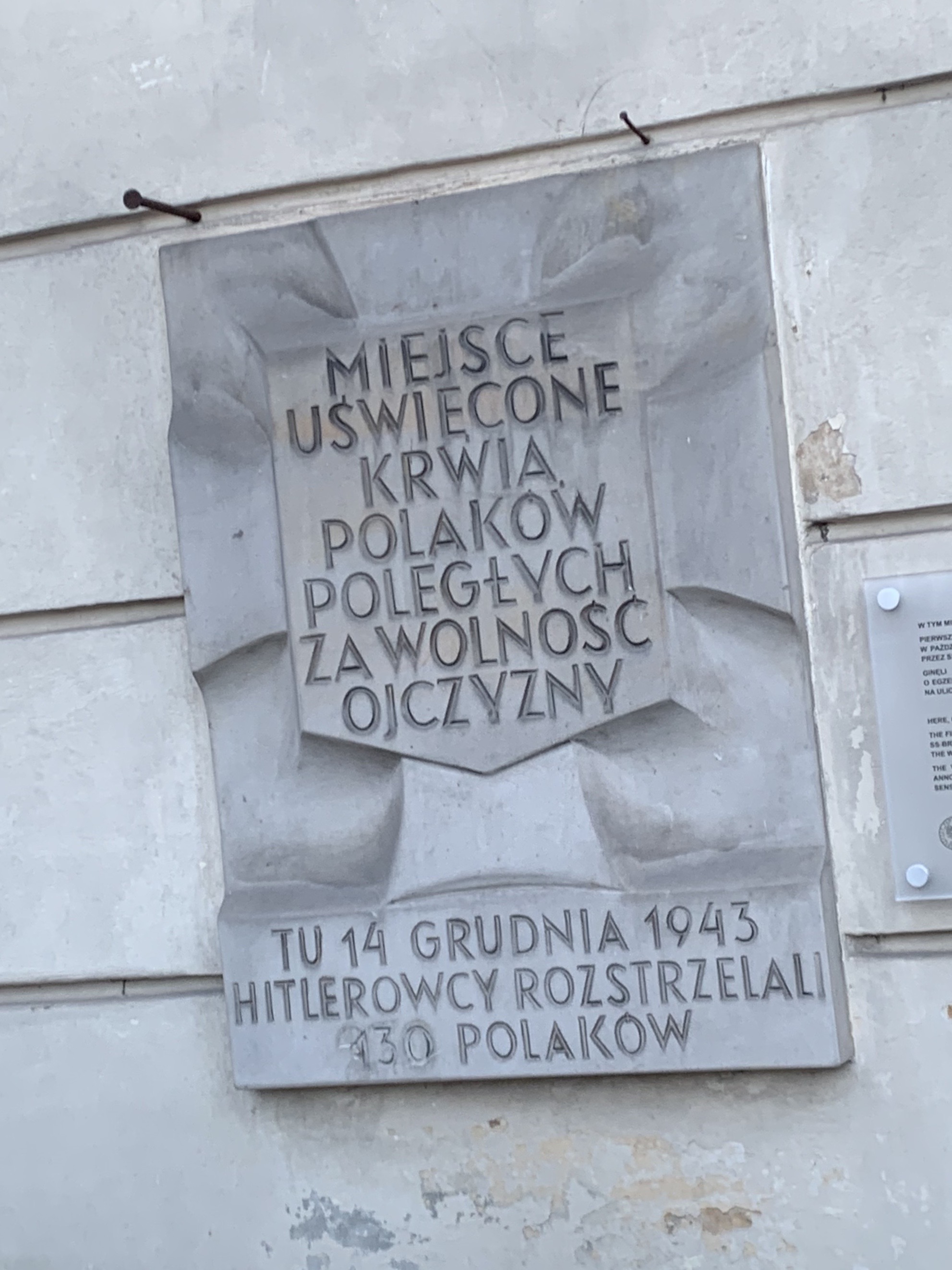 Walking around Warsaw it’s impossible to miss Tchorek Plaques. Named for the sculptor who designed them, Karol Tchorek, they memorialize places of mass executions during German occupation. More than 200 are scattered throughout and say “MIEJSCE UŚWIĘCONE KRWIĄ POLAKÓW POLEGŁYCH ZA WOLNOŚĆ OJCZYZNY”, translation “this place is sanctified by the blood of Poles fighting for the freedom of their homeland”.