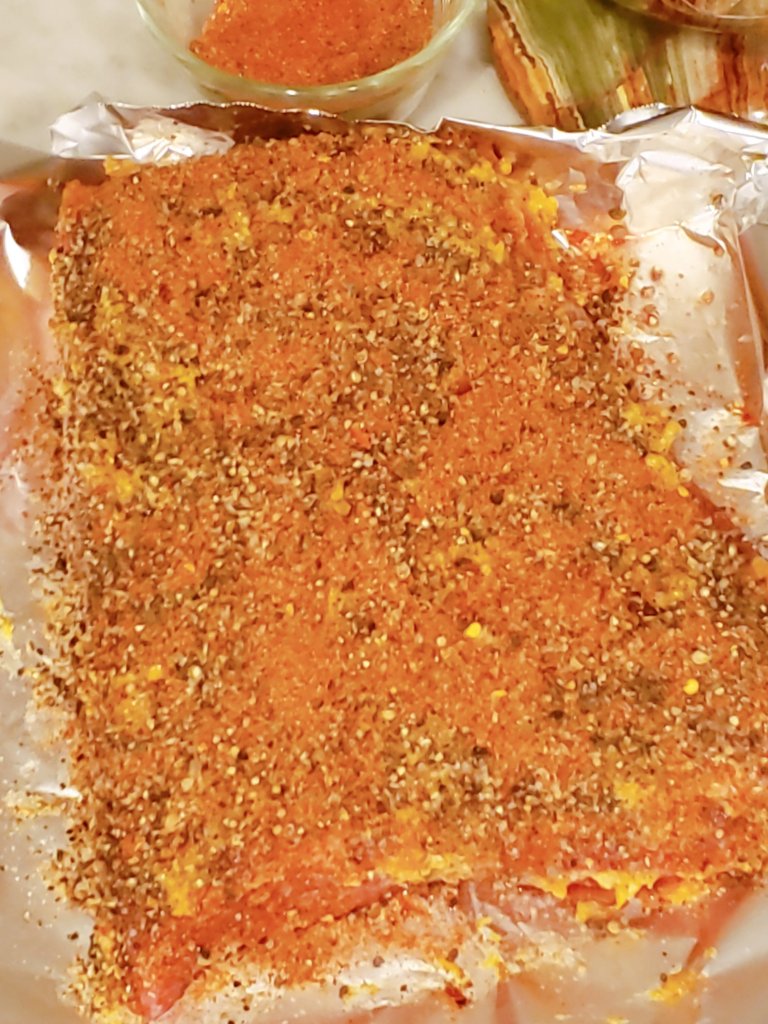 The main secret to a great pastrami is that you grind your own fresh black peppercorns and mustard seeds. I use a tablespoon of rough salt to help the process along in the mortar with a pestle.